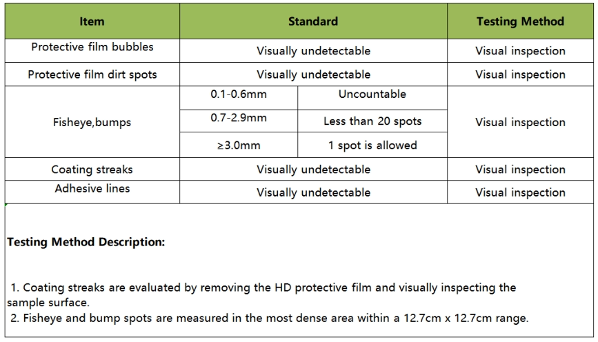 Testing Method Description:•HC Protective Film Elongation at Break: Refers to the elongation value recorded when the HC coating fractures during tensile testing of the finished product, conducted in accordance with GB/T1040.1 Plastics—Determination of tensile properties—Part 1: General principles.•Aged Peel Strength (Storage Condition): Indicates the 180° peel strength measured per GB/T2792 after the sample undergoes 65°C/72h aging treatment.•Aged Peel Strength (Application Condition): Indicates the 180° peel strength tested after the adhered sample undergoes 65°C/72h aging treatment and subsequent cooling to ambient temperature.