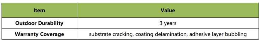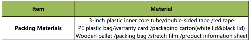 Instructions:•The weatherability of all protection wrap films must meet specified storage conditions and standardized installation procedures throughout their service life.•For defects covered by the warranty, strict adherence to product use and maintenance protocols is mandatory. Detailed specifications are provided on the pack-in identification card and official statement included with the product.